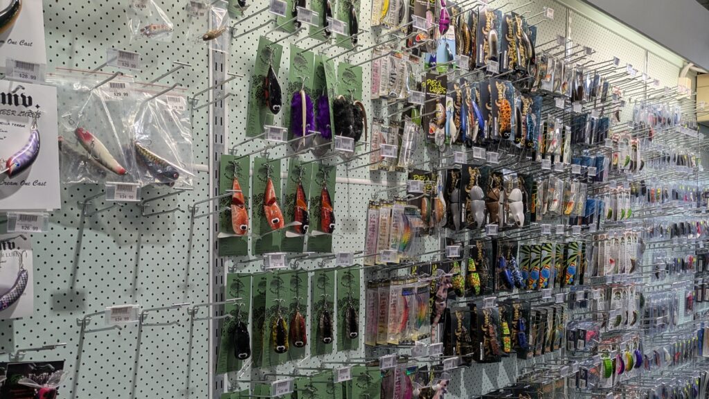 最大60㎝ほどのジャークフライと呼ばれる大型なフェザージグ(?)や、パイク用の大型スイムベイトが目立ちました。