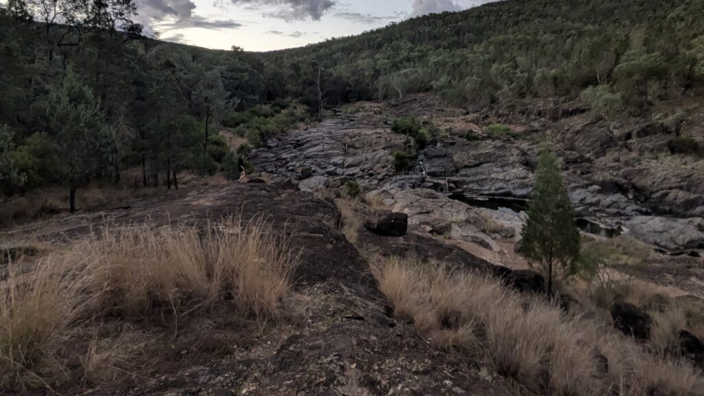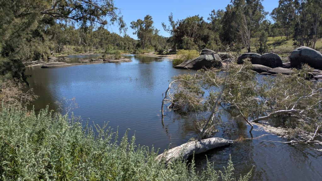 ハンモックで寝付けずに衛星写真をひたすら探索していたところ、ダムに接続する水域で水量が安定していそう、かつマーレーコッドが潜んでいそうな岩場の多いエリアを発見しました。