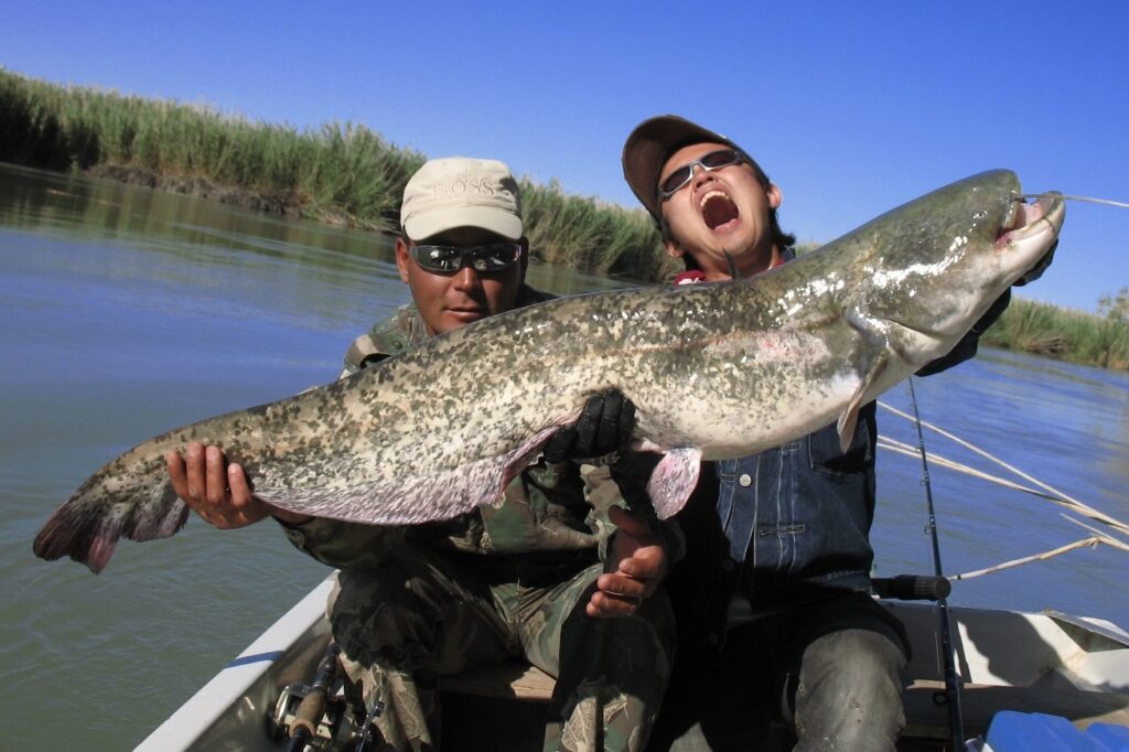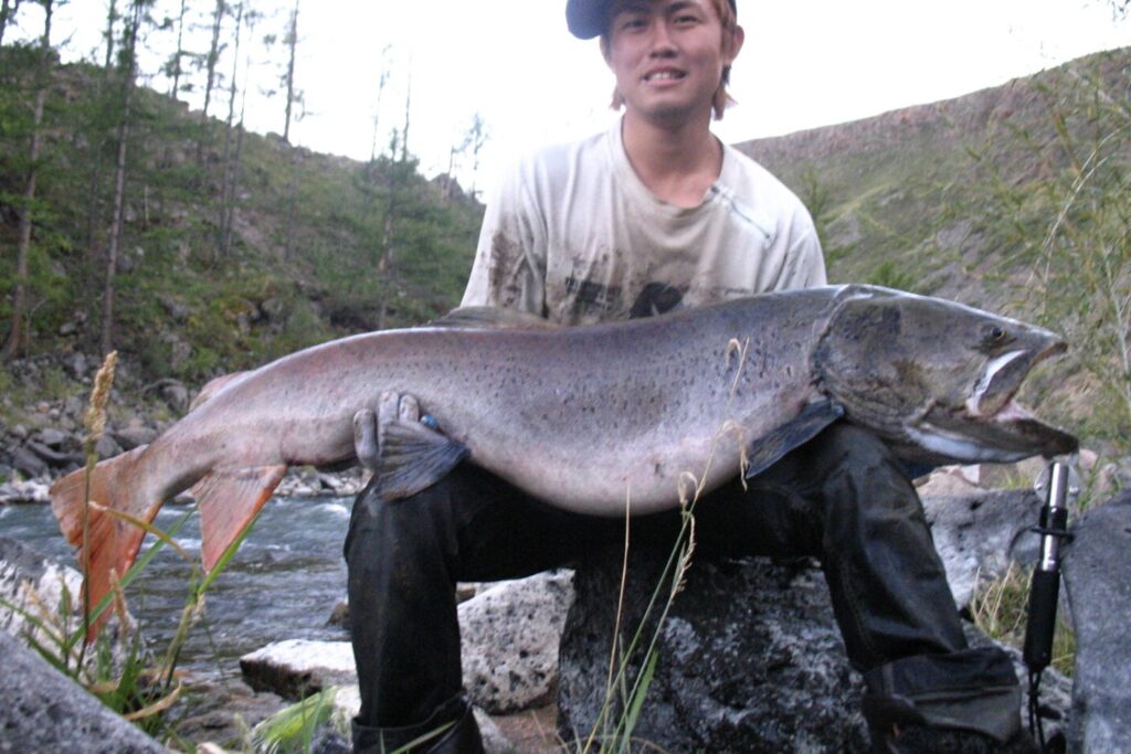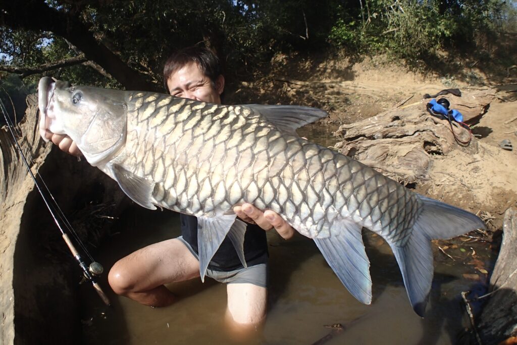 ユーラシア大陸では筆頭にヨーロッパのウェルズ(ヨーロッパオオナマズ、IGFA世界記録134.97kg)、次点でアジアのグーンシュ(IGFA世界記録75kg)が大陸を代表する“怪物”になろうかと思います。写真のウェルズは2005年の旅で、カザフスタンにて。雷魚ロッド等で挑みましたが、大型は掛からず。写真の161cm(40kgクラス)のグーンシュはルアーで。45gのメタルバイブで、7フィート半の1&ハーフXHクラスのルアーロッドで水深約7mの淵底でヒットさせましたが……バットパワーが足りず、対岸の瀬まで泳ぎながらファイトしてキャッチ。いざ飛び込んだものの、水温は体感20℃を切っており、結構危なかった……。もう1種ユーラシア大陸で“怪物”を上げるならタイメン(IGFA世界記録は52.39kg)。活性の高い個体は荒瀬につくイメージがあり、この魚もバスロッド(MHクラス)で掛けましたが全く止められず、流れに飛び込み共に流れ下って対応しました。