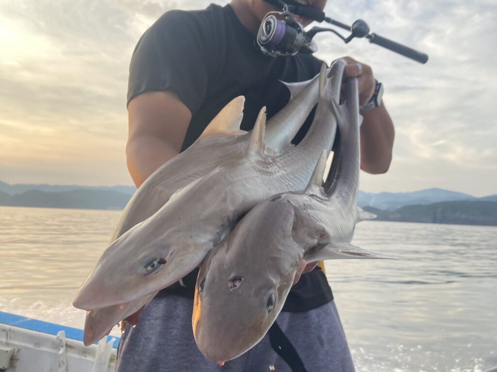 オモリグなども想定して持ち込んでいた「ケアラシ」では、タックルそのまま、ハタ類やタイ類狙いで釣ったイカを落とし込むと……サメが連発したり、