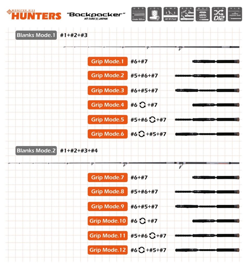 最長7’6ftから最短5’8ftまで 4段階変長に加え、グリップ脱着&再構築(MGC)により最大 12 のモードへ可変。