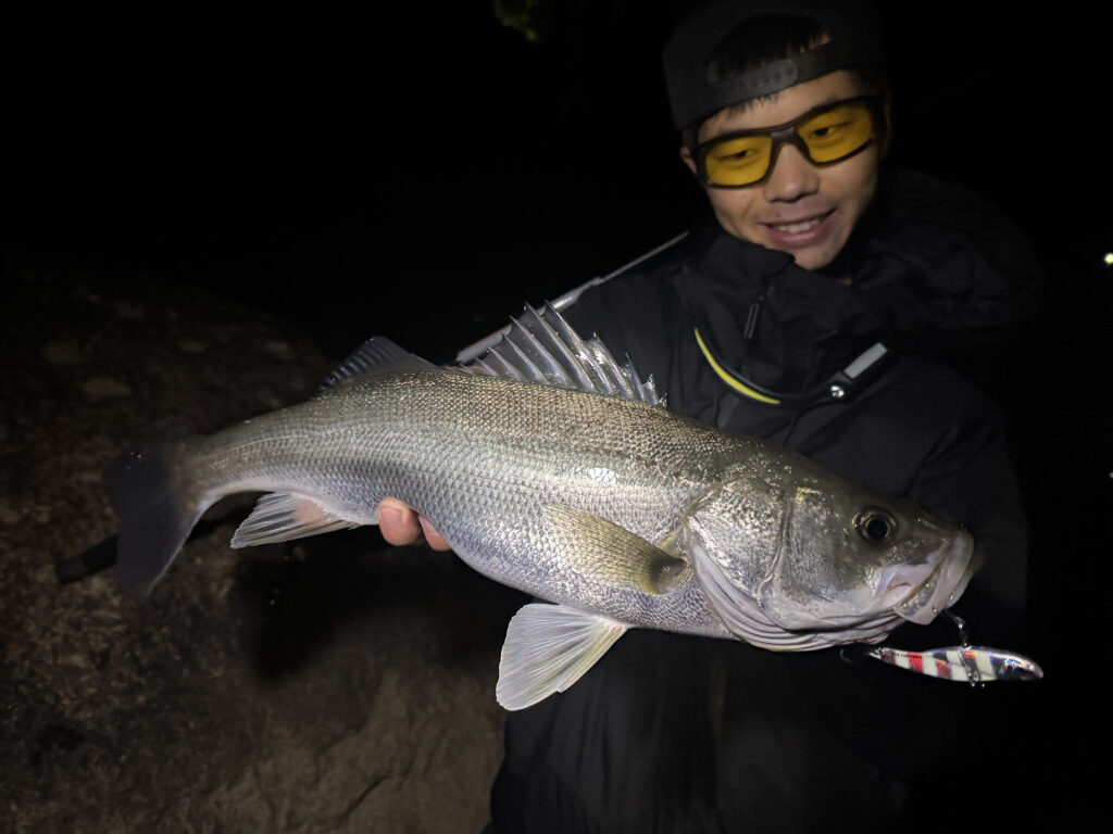 大型タイリクスズキはいい時期の宿題として、この時期現地アングラーおすすめの、メタルバイブを使ったスカイゲイザー(空に向けた口、の意)ゲームを楽しむことに。