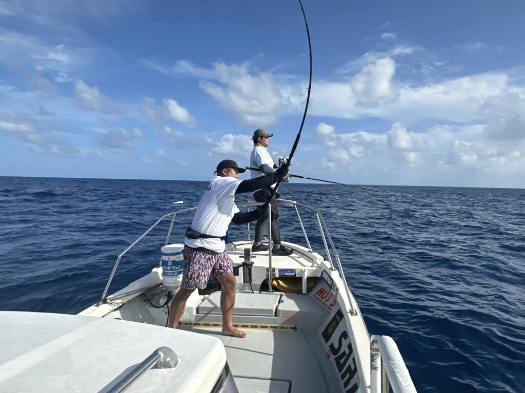 そのまま魚が船の真下へ入って行ったので、竿はギンバルに入れずに脇抱えファイト。