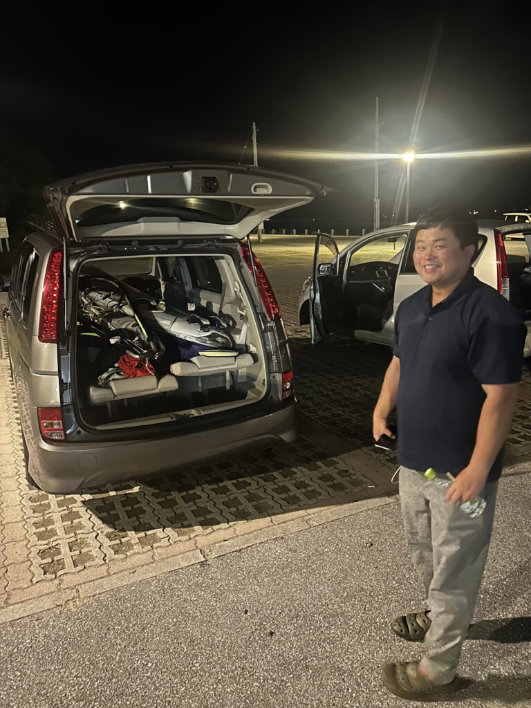 おおよその器具はオーナーの軽自動車に詰め込んでもらいつつ、空いたスペースに我々の荷物をイン。