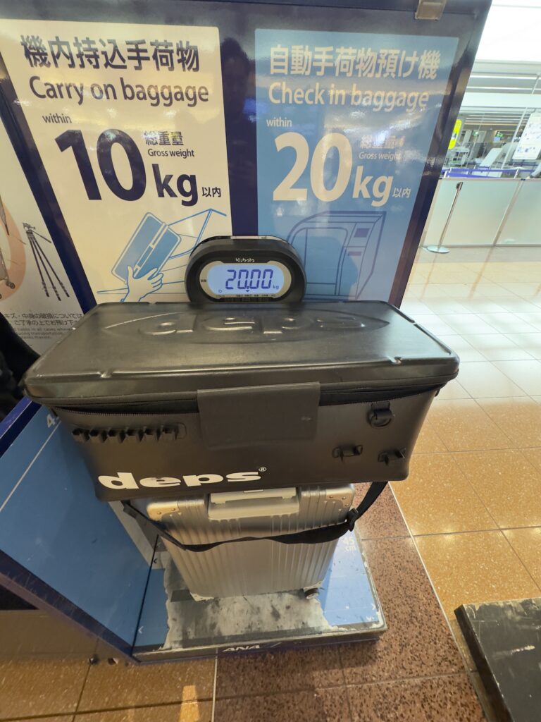 リールやジグなどちょっと重たい物をリュックに移してなんとか20kgジャストに抑えました。