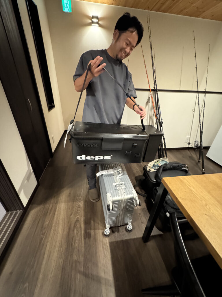 荷物が多くなりがちなオフショア遠征ですが、竿までバッカン1つに釣り具をまとめられれば、まだ片手が空く。