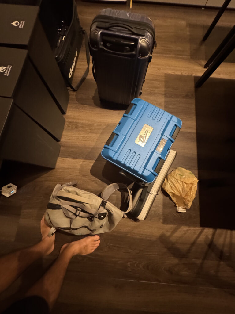 ターザンの荷物は、機内持ち込みのリュック&セミハードケース(ディアモン)、預け荷物にはスーツケースとドカット(ロッド以外の釣具全て)。